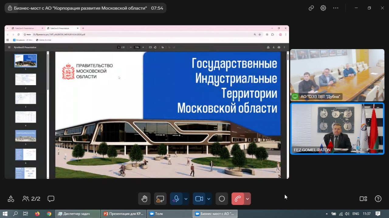 16 апреля 2026 года директор РУСП «Агентство развития и содействия инвестициям» Бобович А.П. совместно с руководством администрации СЭЗ «Гомель-Ратон» принял онлайн-участие в переговорах с руководством Корпорации развития Московской области и ОЭЗ «Дубна».